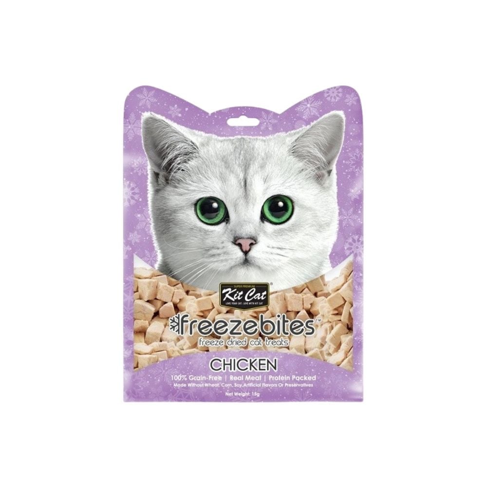 Kit Cat Freezebites de Pollo ofrece proteína pura y baja en grasa gracias a su exclusivo ingrediente de pollo liofilizado. Un snack nutritivo, palatable y apto para gatos con sensibilidades alimentarias.