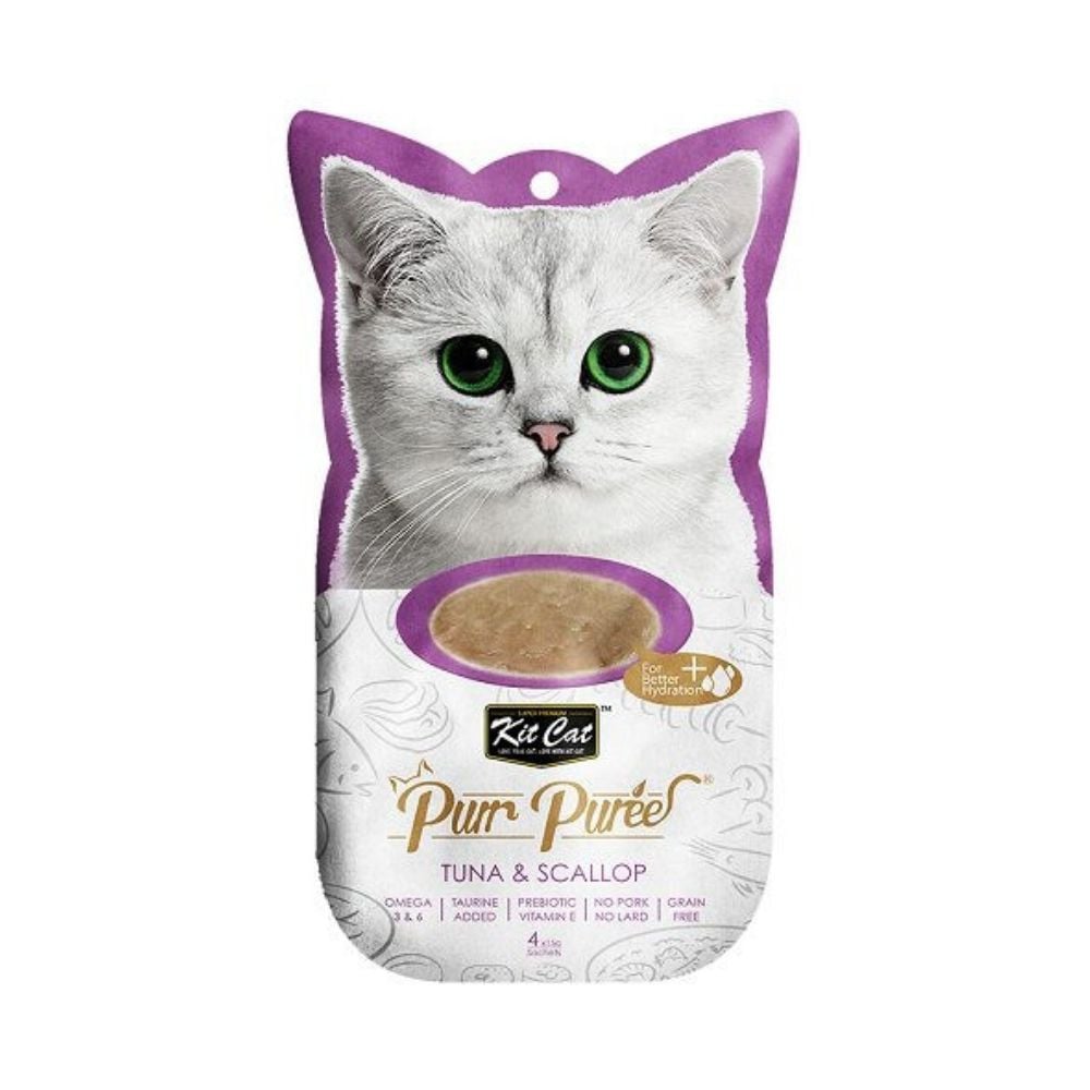 Kit Cat PurrPuree Atún y Vieiras transforma el snack en un momento de hidratación y nutrición gourmet, gracias a sus ingredientes marinos naturales y su textura cremosa irresistible.